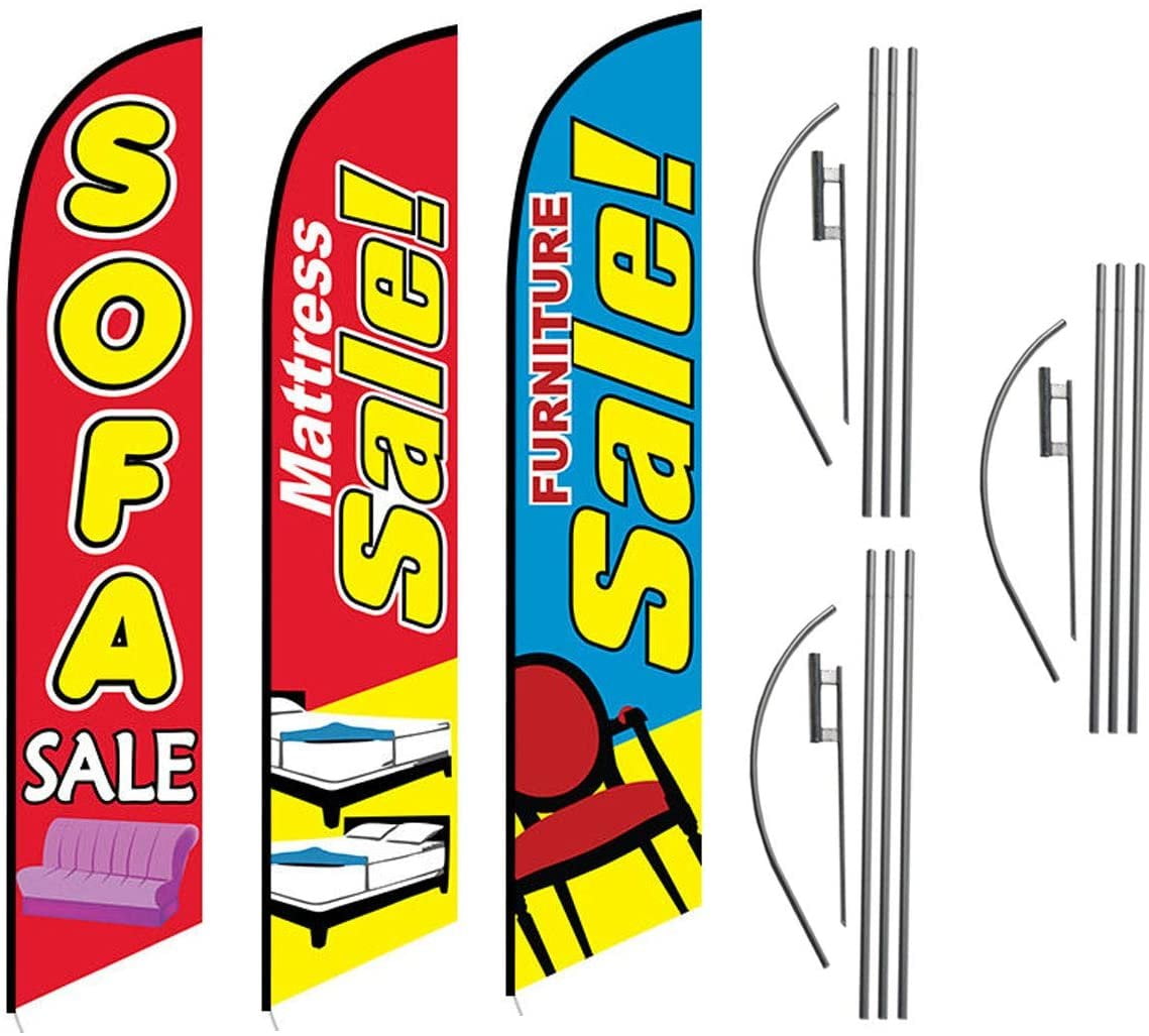 This item mattress and furniture outlet advertising package of 3 feather banner flag kits and ground stakes, mattress sale, furniture.